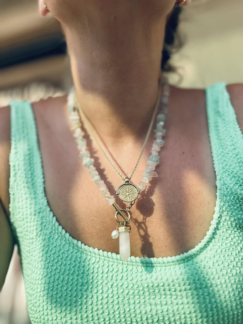 Elevate your summer glow with our dreamy multi-gemstone necklace—handcrafted with a radiant mix of rose quartz, aquamarine, amazonite, and prehnite in a pastel palette inspired by the first light of summer mornings. This beaded beauty is your go-to accessory for sun-soaked days and breezy boho moments.
